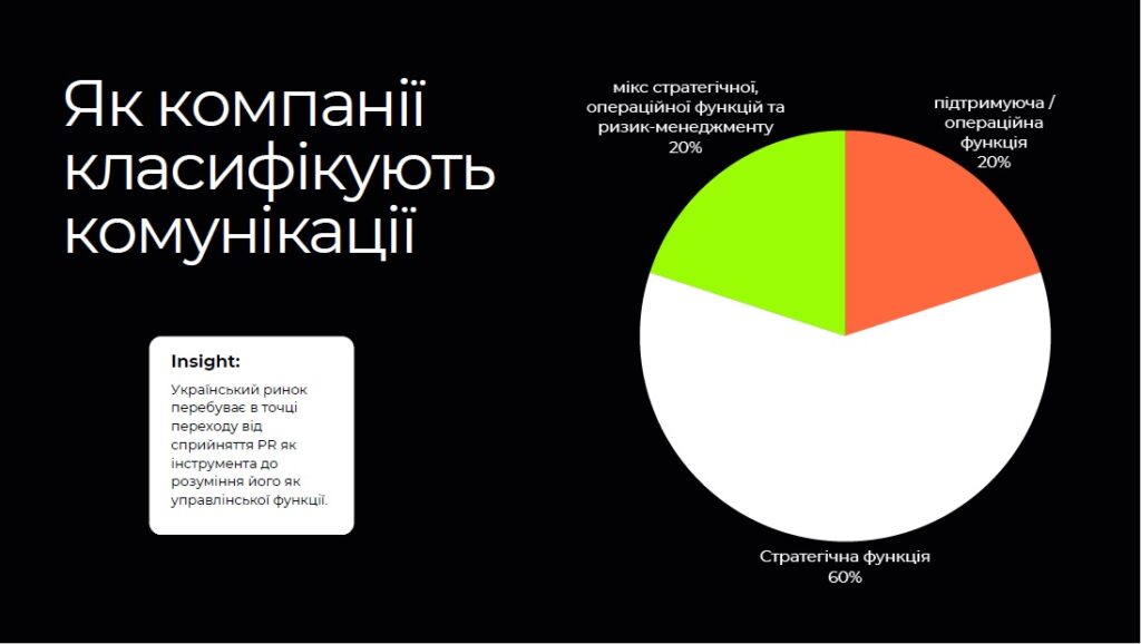 Лише 60% компаній розглядають комунікації як стратегічну функцію. 20% — як операційну підтримку. Ще 20% — як мікс між стратегією, операційкою і ризик-менеджментом.