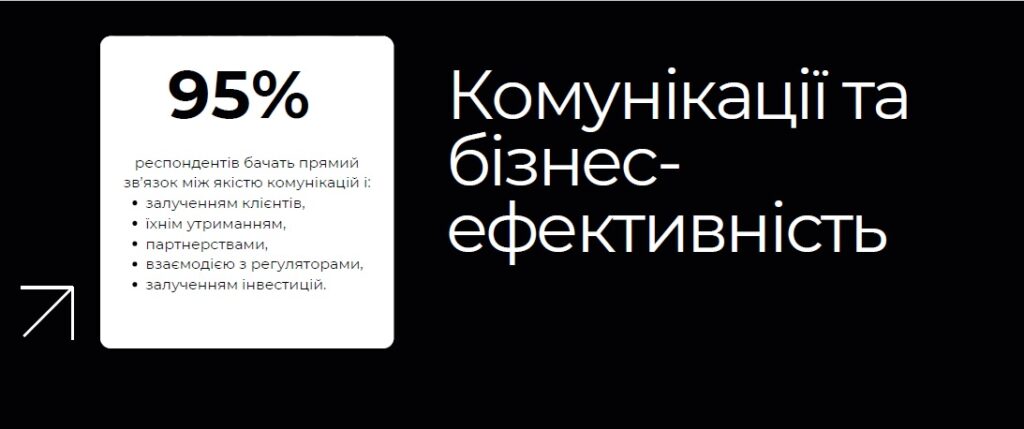 95% респондентів бачать прямий зв’язок між якістю комунікацій і п’ятьма ключовими бізнес-метриками: залученням клієнтів, їхнім утриманням, партнерствами, взаємодією з регуляторами і залученням інвестицій.