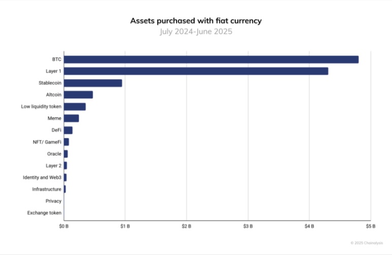 Біткоїн лідирує серед криптоактивів, придбаних на централізованих біржах за фіатні валюти в період з липня 2024 року по червень 2025 року. Саме ця криптовалюта забезпечила приплив фіатних валют обсягом 4,6 трлн доларів протягом цього періоду. Це перевищує наступну за величиною категорію, токени першого рівня (без урахування BTC та ETH), обсяг купівлі яких склав приблизно 3,8 трлн доларів. Стейблкоїни посіли третє місце з 1,3 трлн доларів, а альткоїни йдуть за ними з приблизно 540 млрд доларів. Інші категорії, включаючи токени з низькою ліквідністю, мем-коїни та DeFi, отримали менше ніж 300 млрд доларів припливу фіатних валют кожна.
