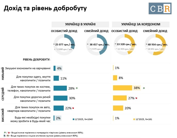 Кінець року відзначився певним погіршенням добробуту для обох аудиторій. При чому серед тих опитаних, хто в Україні, покращувався персональний дохід (через відновлення зайнятості), але погіршувався загальний дохід сім’ї. А серед українців, які за кордоном, погіршення було більш суттєвим і відбувалось як за рахунок персонального доходу, так і зарахунок загального доходу сім’ї.
