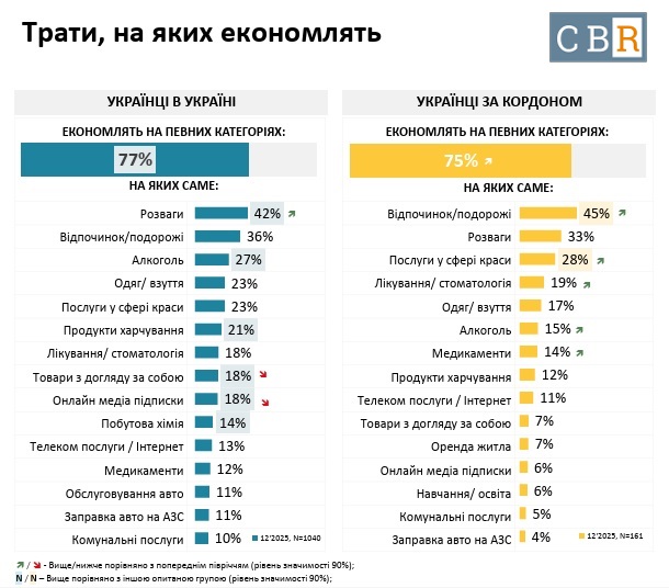28% українців в Україні зазначили, що їм необхідно накопичити кошти або ж оформити позику на таку покупку, як костюм або телефон, 30% – для купівлі дорожчих речей, 22% – на купівлю авто або квартири. Серед українців за кордоном ці показники складають 38%, 27% та 20% відповідно. Українці, що мешкають в Україні, найбільше економлять на розвагах (42%), українці в інших країнах – на відпочинку та подорожах (45%).