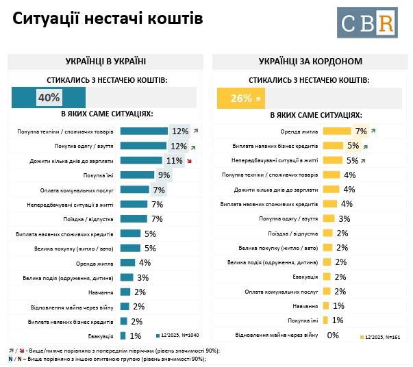40% респондентів, які наразі перебувають в Україні, стикаються з різними ситуаціями нестачі коштів, особливо пов’язаними з покупками споживчих товарів та задоволення базових потреб. Серед тих, що знаходяться за кордоном, таких 25%, вони частіше стикаються з ситуаціями нестачі коштів на оренду житла та виплати бізнес кредитів.