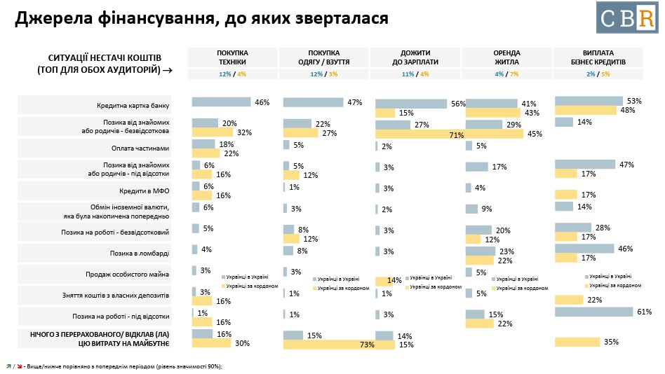 Серед джерел фінансування в цих випадках за популярністю лідирує кредитна картка банку, наступною йде позика від знайомих або родичів (безвідсоткова), далі – оплата частинами.